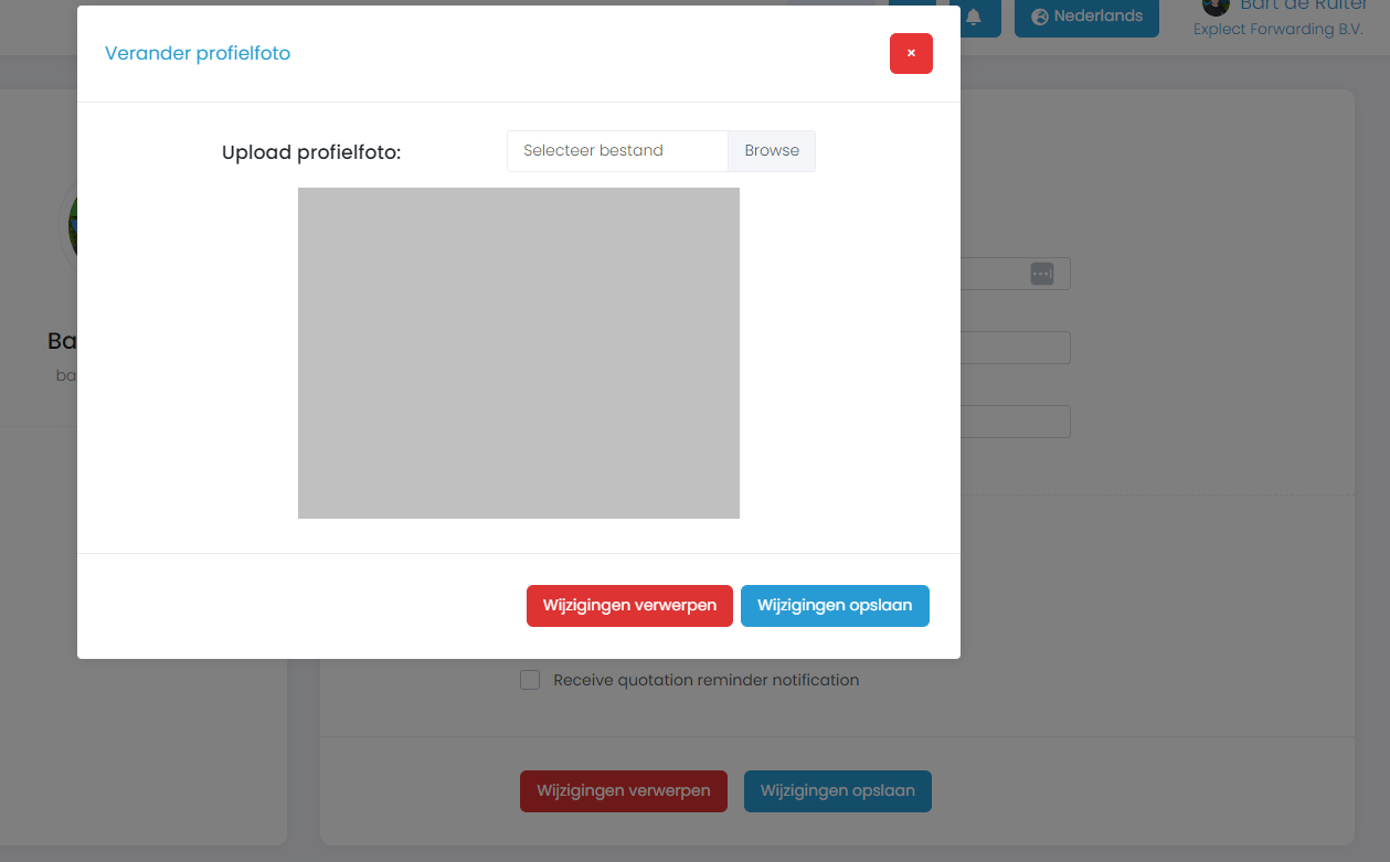 Om je profielfoto te wijzigen, klik je op je huidige profielfoto in het profielgedeelte. Dit opent een venster waar je een nieuwe foto kunt uploaden. Selecteer een bestand vanaf je computer door op "Browse" te klikken en kies de gewenste afbeelding